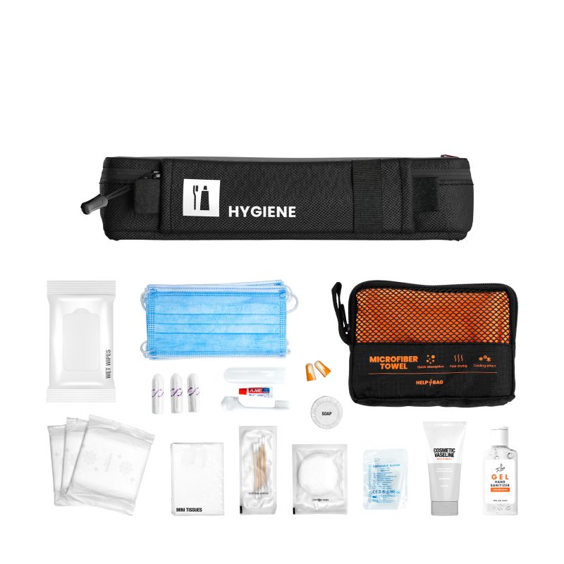 - Kosmetika / Körperpflege-Produkte für Notsituationen, z.B. Übernachten in einer Notunterkunft mit Hygienemasken, Desinfektionsgel, Feuchttücher, Taschentücher, Tampons, Reinigungsstäbchen, Watte, Shampoo, Damenbinden, Seife